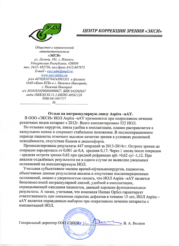 В ООО «ЭКСИ» ИОЛ Aapira – aAY применяется при оперативном лечении различных видов катаракт с 2012 г. Всего имплантировано 522 ИОЛ. По отзывам хирургов, линза удобна в имплантации, плавно расправляется в капсульном мешке и сохраняет стабильное положение. В послеоперационном периоде пациенты отмечают высокое качество зрения в условиях различной освещенности, отсутствие бликов и дискомфорта.